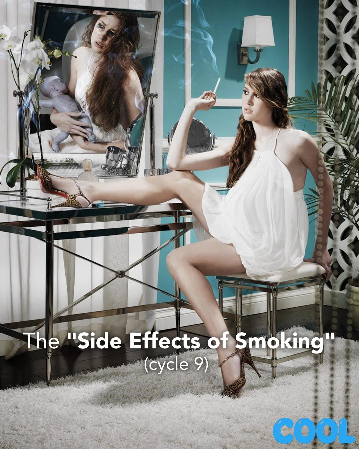 Cycle 9 decided to take a public service stance with an anti-smoking photoshoot. The concept involved a "glamorous" smoking shot paired with a "consequence" shot, where models were made up to look like they were suffering from the physical ravages of smoking—including premature aging, lung disease, and even facial burns.